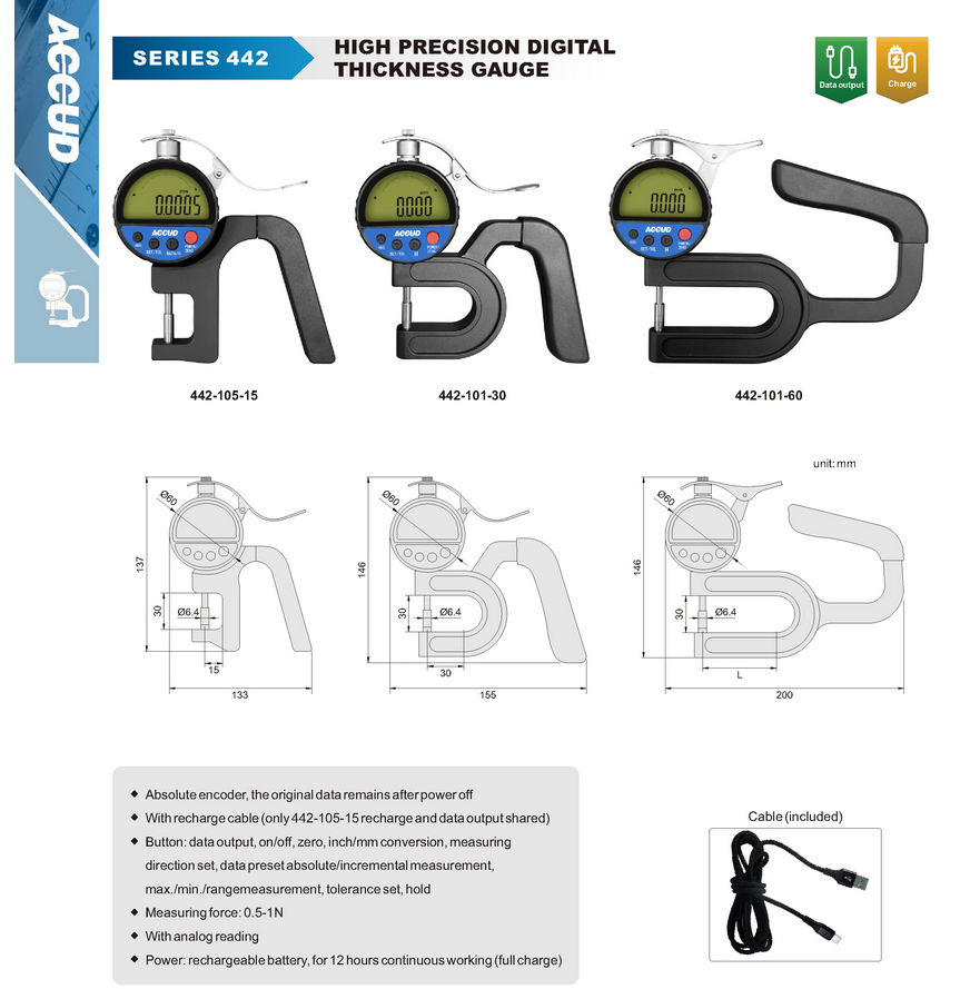 ACCUD DIGITAL THICKNESS GAUGE WITH CONSTANT MEASURING FORCE 465-010-01 465-010-11