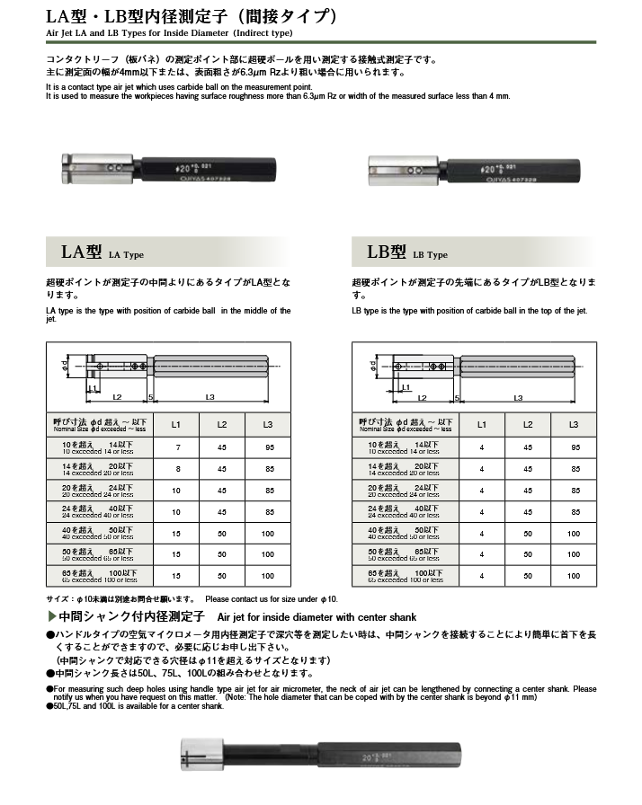 Ojiyas‘s airjet plug acts like a measuring probe. and used in conjunction with the display The Ojiyas air jet plug model LA & LB is a contact air jet which uses a carbide ball at the measurement point. Used for measuring workpieces with a surface roughness greater than 6.3 µm Rz or a measured surface width less than 4 mm.